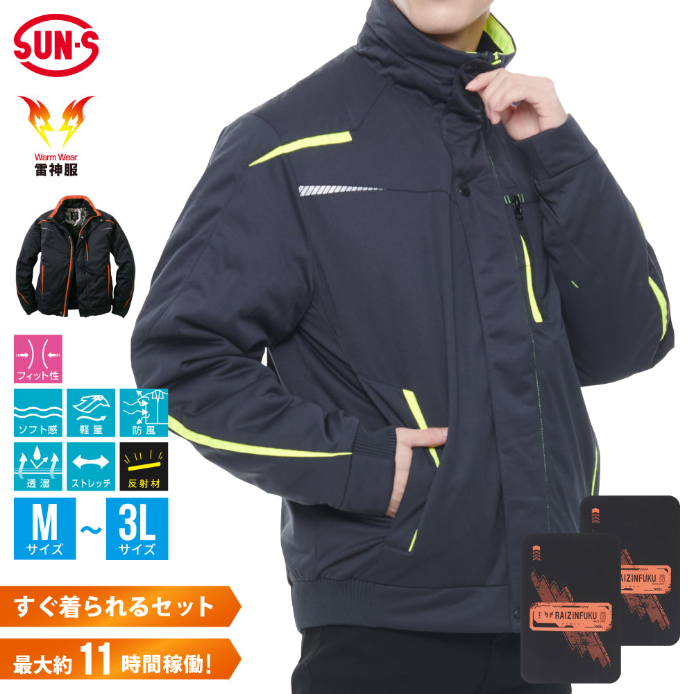 サンエス 雷神服® 長袖 アウター ブルゾン 防寒 フィット性 ソフト感 軽量 防風 透湿 ストレッチ 反射材 アルミプリント 保温性 水洗い可能 ネイビー ブラック 男女兼用 ユニセックス メンズ レディース 男性 女性 秋 冬 寒さ対策 冬対策 スポーティ スポーツ アウトドア ジョギング ウォーキング キャンプ ワーク ワーキング 作業服 現場 運送 作業 通勤 通学 電車 自転車 バッテリー別売り