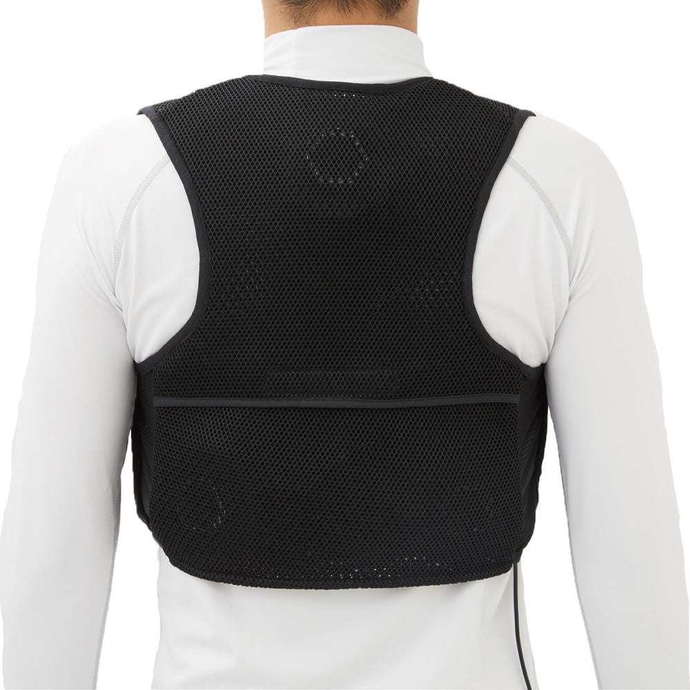 背中面3ヵ所にペルチェデバイスを装着し、脇のコードホールからケーブルを通してポケット内のバッテリーと繋げます。